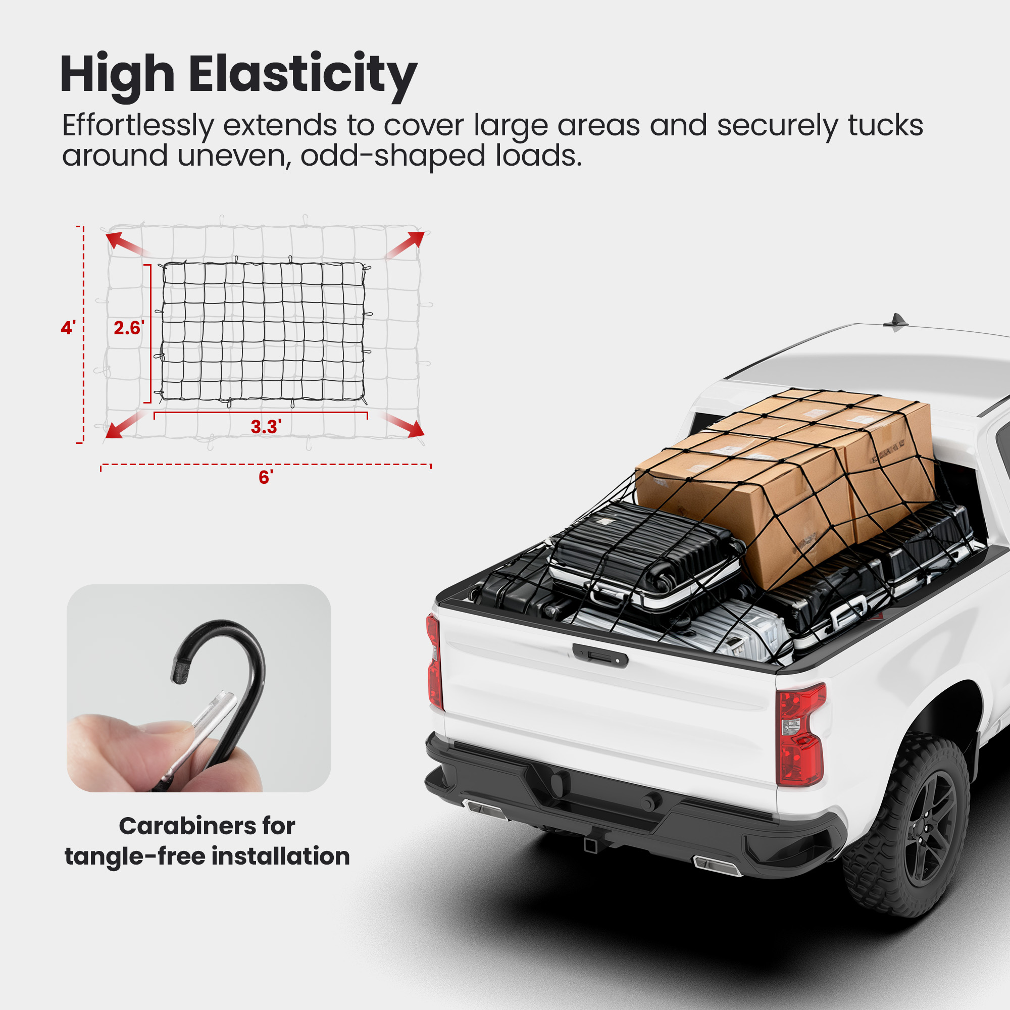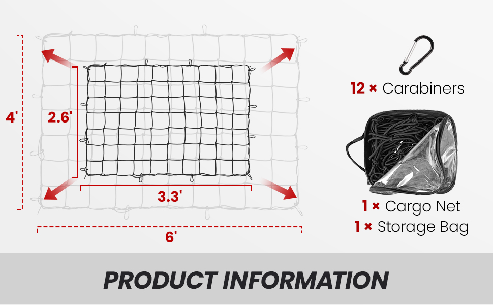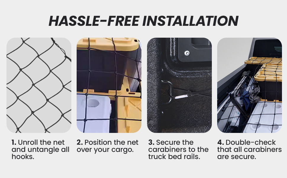 • HASSLE-FREE INSTALLATION: Simply position the net over your cargo and attach the included carabiners to your truck bed rails. Please ensure your vehicle is equipped with cargo tie-downs before purchase.