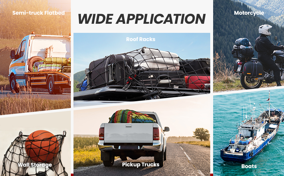 • MULTIPURPOSE: Ideal for securing large loads on pickups, trailers, SUVs, and boats, it can also be folded to store smaller items on bikes, motorcycles, or walls for organized storage.