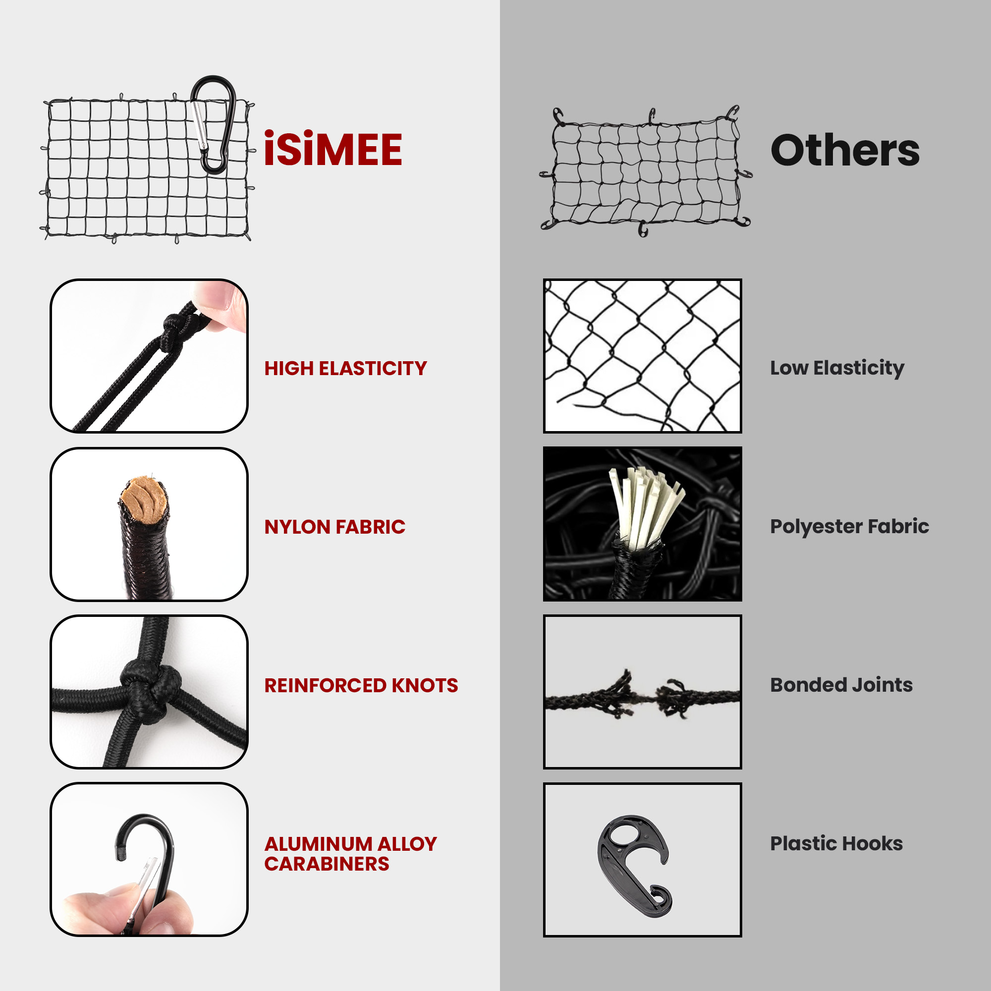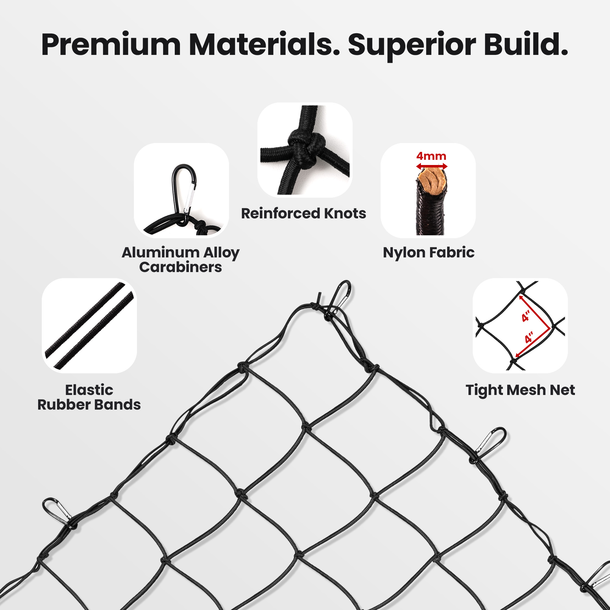 • PREMIUM MATERIALS: The 4mm upgraded rubber core, tightly wrapped in nylon, offers exceptional strength and flexibility, ensuring your cargo stays secure and the net withstands heavy use.