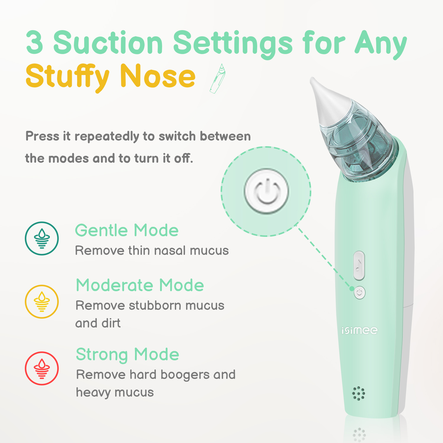 • THREE SUCTION LEVELS: Unlike ordinary manual nasal aspirators and pumps, 3 suction strength modes are selectable for maximized safety.