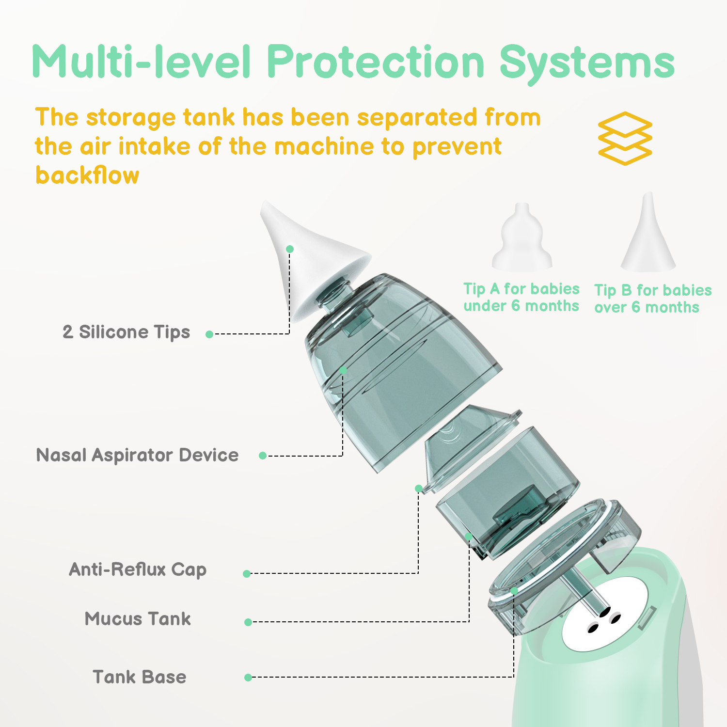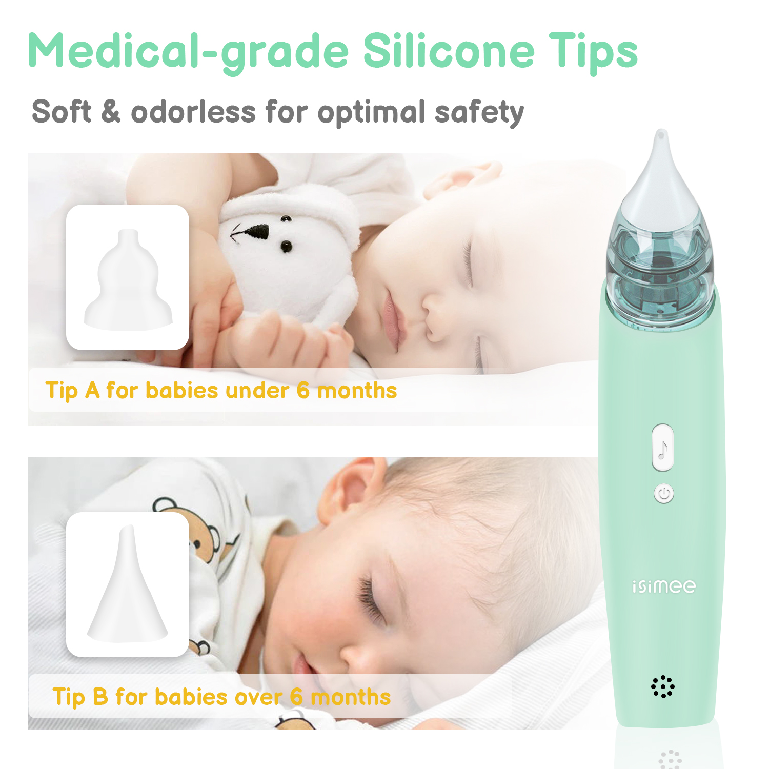 • MEDICAL-GRADE SAFETY: Medically tested suction strength standards do not damage the baby’s nasal mucosa. The selection of safe and hygienic silicone tips is optimized for different age groups.